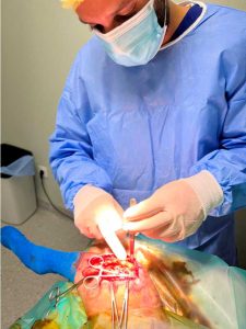 El perro es colocado en decúbito dorsal, es decir, acostado boca arriba, para facilitar el acceso a la rodilla afectada. Se limpió y esterilizó el área quirúrgica para reducir el riesgo de infecciones procediendo el cirujano a realizar una incisión en la piel sobre la rodilla afectada para acceder a la articulación.