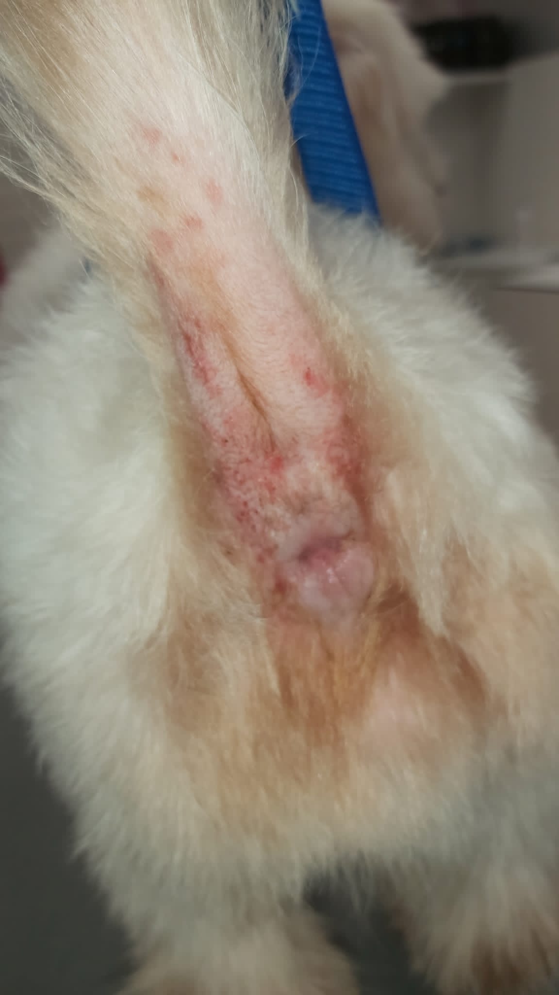 Ori tiene dos años y es un perrito muy bueno. Hace un mes, durante su sesión de peluquería, observamos algunas zonas alopécicas en sus codos y alrededor del ano y la cola, así como lesiones en las almohadillas y en las puntas de las orejas, por lo que recomendamos realizar un test de leishmaniosis para descartar… con tan mala suerte, que resultó ser positivo.