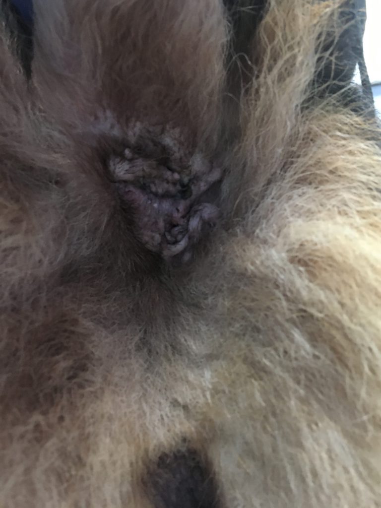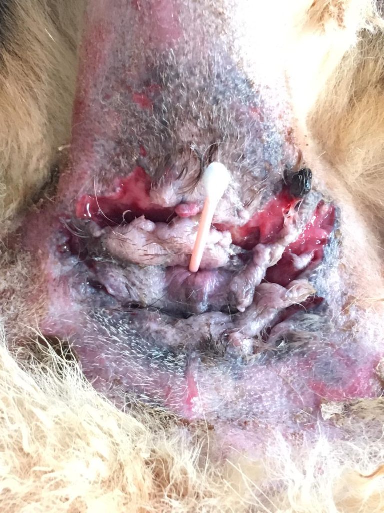 Trudi es una preciosa pastor alemán de 6 años que acude a consulta el pasado mes de abril porque sus propietarios habían notado que se lamía excesivamente la zona perianal y desprendía un olor desagradable. Debido a que Trudi manifestaba dolor, procedimos a realizar la exploración bajo sedación. Nos encontramos con múltiples trayectos fistulosos, abarcando toda la circunferencia del ano, así como una dermatitis húmeda y secreción sanguinopurulenta. Procedimos a rasurar todo el pelo de la zona dañada para favorecer la aireación así como limpiar y desinfectar la zona.