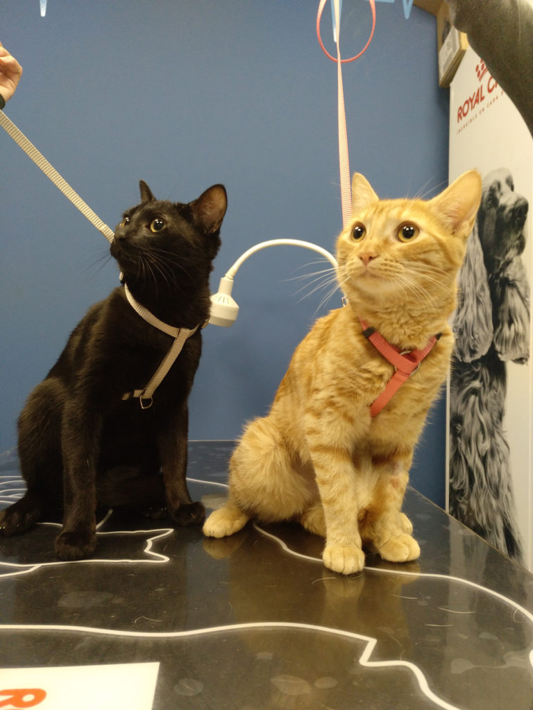 Cuando llegaron a consulta por primera vez, tenían hongos dermatofitos en su piel. Pero tras su correspondiente tratamiento y cómo se puede observar en las imágenes, están completamente recuperados, sanos, guapos y mantienen su carácter cariñoso. Además, han sabido adaptarse perfectamente al uso de arnés, gracias al acostumbramiento precoz del mismo. Hay que saber, que el empleo de arnés de forma temprana es la mejor manera de que en un futuro podamos usarlo sin ningún tipo de problema.