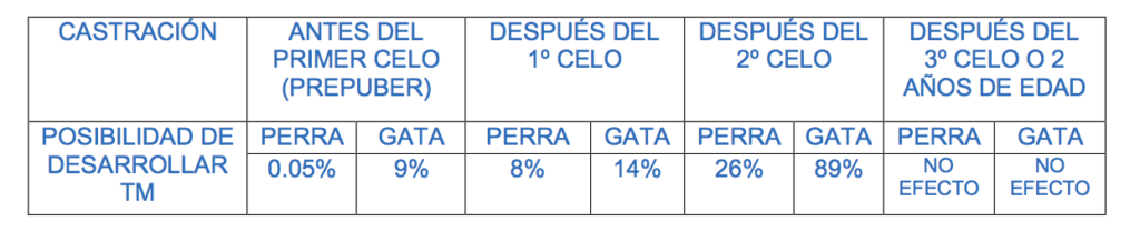 Según el grupo de oncología (GEVONC) de la asociación de veterinarios españoles especialistas en pequeños animales (AVEPA) se debe castrar a nuestras mascotas para disminuir la posibilidad de que desarrollen tumores mamarios (TM) (tabla1), además se debe evitar el uso de medicamentos anticonceptivos ya que con ellos aumentamos el riesgo de que se desarrollen estos mismos.
